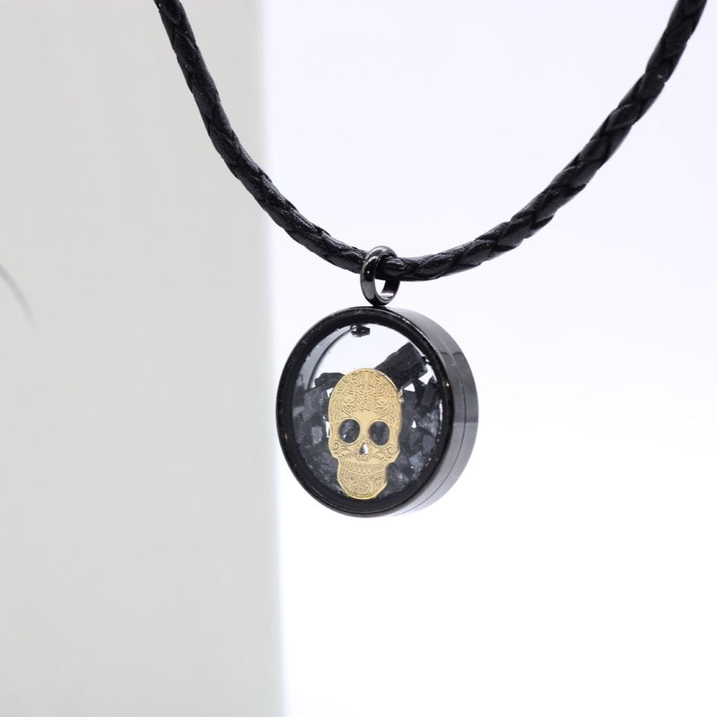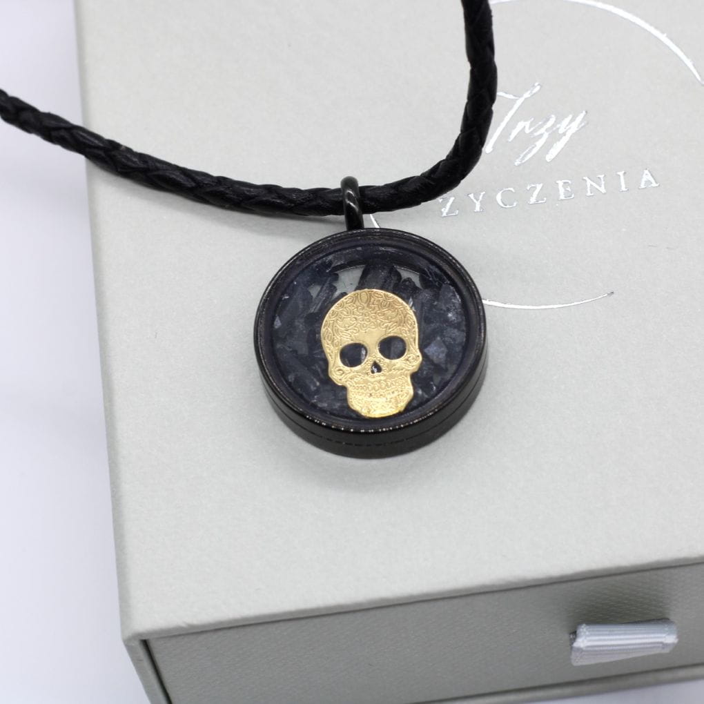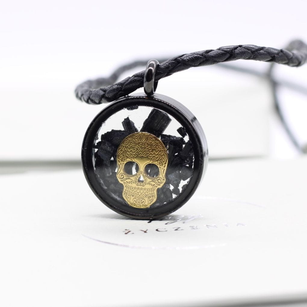 Naszyjnik – sekretnik męski z personalizowanym motywem czaszki i czarnym turmalinem